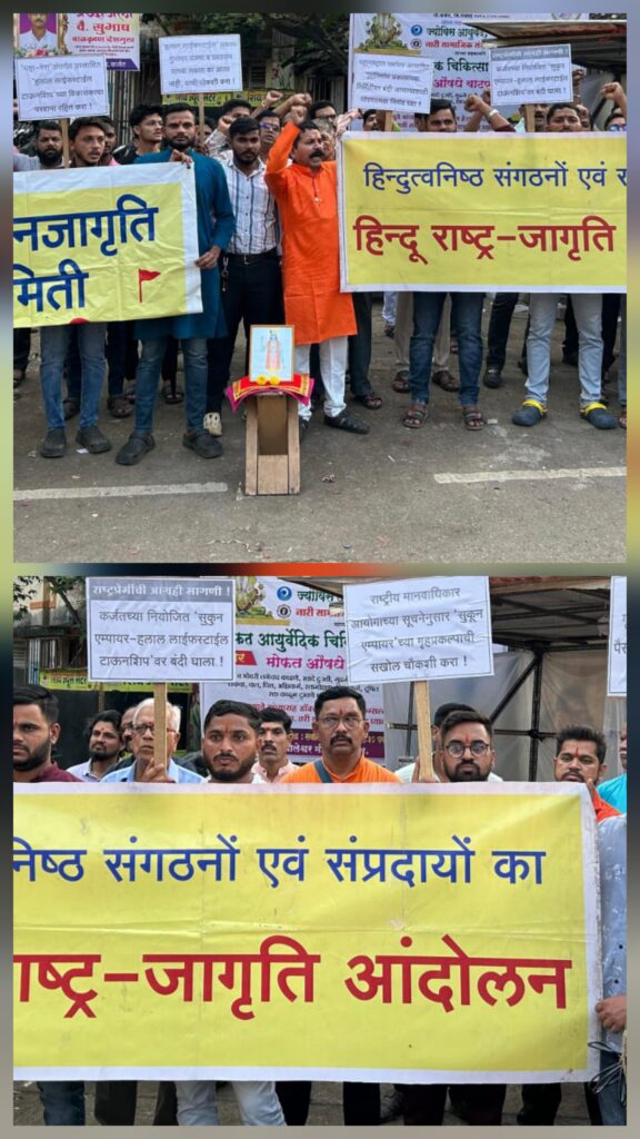 रायगढ़ जिले में कर्जत के पास नेरल में प्रस्तावित ‘सुकून एंपायर-हलाल लाइफ स्टाइल टाउनशिप’ का विरोध करते हुए मंगलवार को प्रदर्शन किया गया। हिंदू जनजागृति समिति मुंबई ने धर्म-आधारित गृह परियोजना का विरोध करते हुए कहा कि केवल मुसलमानों के लिए इस तरह का विज्ञापन करने वाला यह प्रकल्प संविधान, कानून और सामाजिक सौहार्द के विरोध में है इसलिए इस प्रकल्प पर तुरंत प्रतिबंध लगाया जाए।