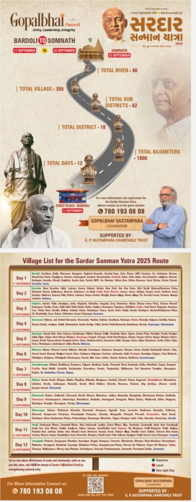गुजरात के बारडोली से सोमनाथ तक सितंबर माह में सरदार सम्मान यात्रा का आयोजन किया जा रहा है। इस कार्यक्रम का आयोजन आगामी 11 सितंबर से 22 सितंबर तक जी पी वस्तरपारा चैरिटेबल ट्रस्ट के गोपाल भाई वस्तरपारा( चमर्डी ) द्वारा आयोजित किया जा रहा है।