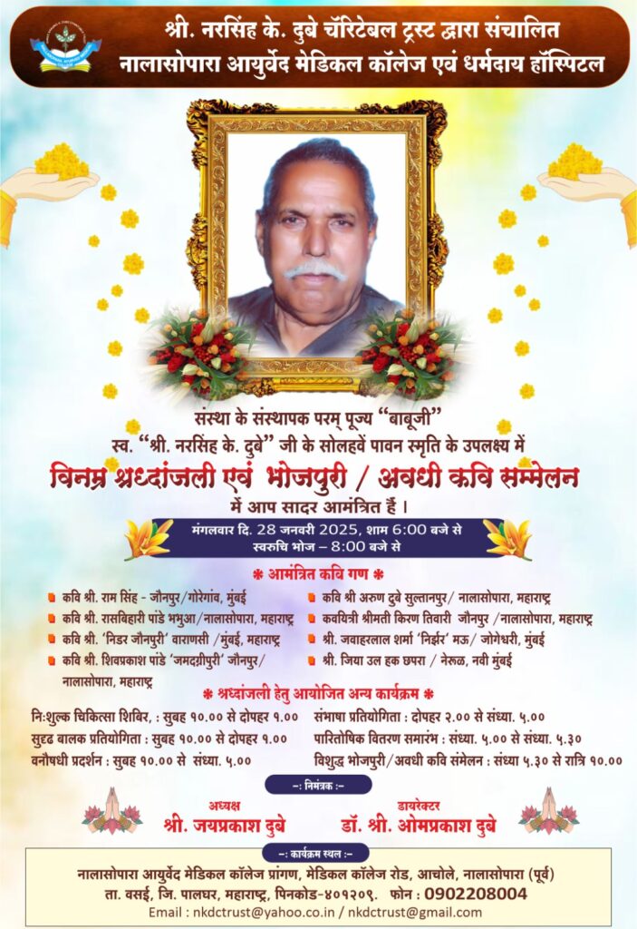 हर वर्ष की तरह इस वर्ष भी 28 जनवरी 2025 को श्री नरसिंह के दुबे चॅरिटेबल ट्रस्ट द्वारा संचालित नालासोपारा आयुर्वेद मेडिकल कॉलेज और अस्पताल ने संस्था के संस्थापक, परम पूज्य “बाबूजी” श्री नरसिंह खेलावन दुबे की सोलहवीं पुण्यतिथि के अवसर पर विभिन्न जनहितपर कार्यक्रम आयोजित किया गया हैं।