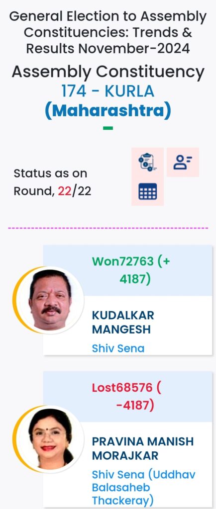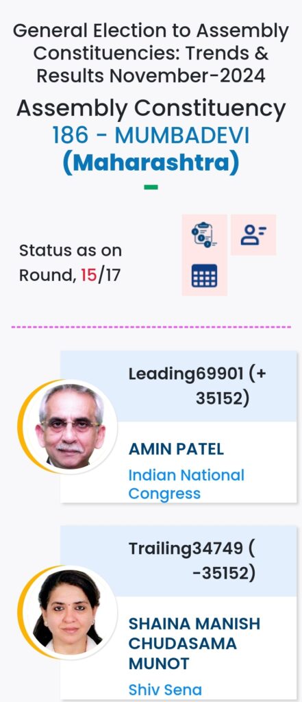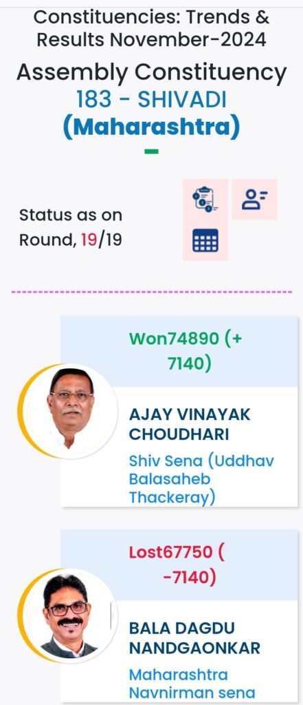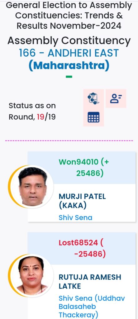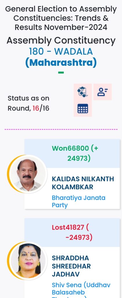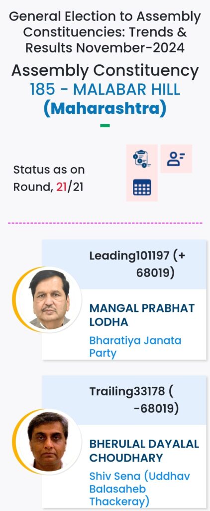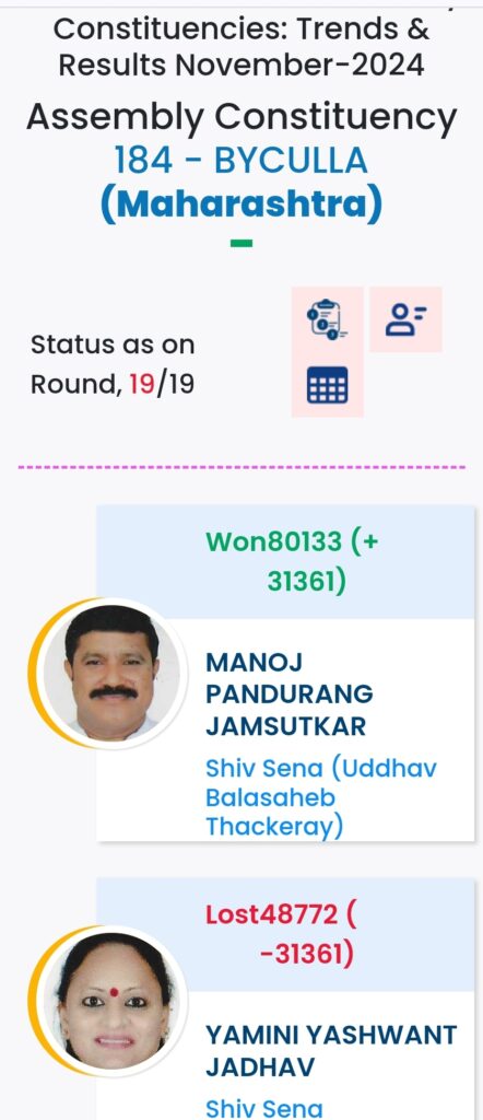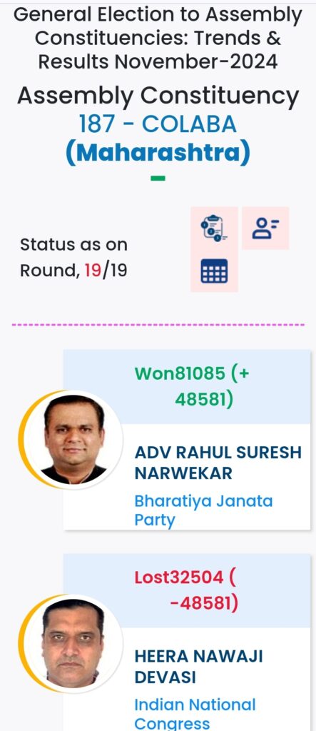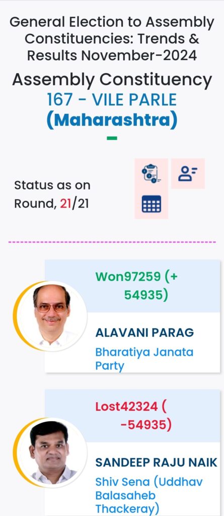 महाराष्ट्र विधानसभा चुनाव में महायुति ने बाजी मारी है. मुंबई मे विधानसभा चुनावों के दौरान विभिन्न पार्टियों के प्रत्याशियों की हालत निम्नलिखित रही:-