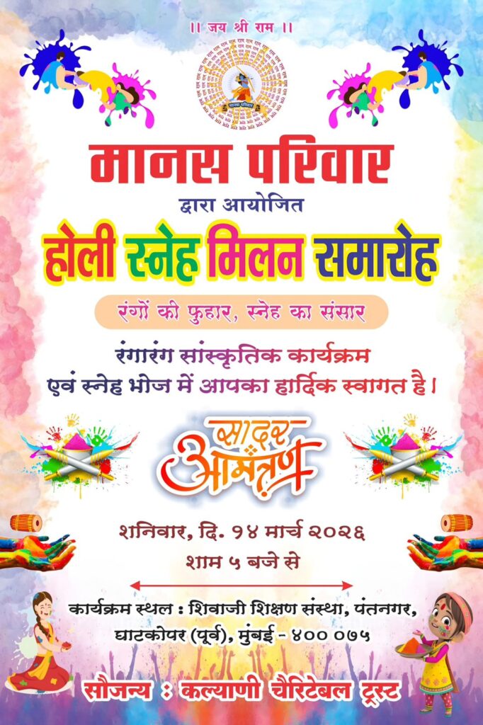 रंगों और उमंगों के त्योहार होली के पावन अवसर पर ‘मानस परिवार’ द्वारा एक भव्य ‘होली स्नेह मिलन समारोह’ का आयोजन किया जा रहा है। यह कार्यक्रम शनिवार, 14 मार्च 2026 को मुंबई के घाटकोपर (पूर्व) इलाके में आयोजित होगा, जिसमें समाज के लोग एकजुट होकर त्योहार की खुशियां साझा करेंगे।