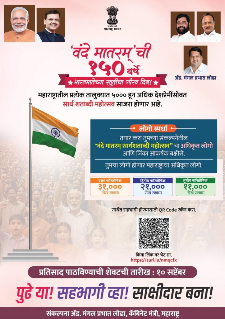 मंत्री मंगलप्रभात लोढ़ा ने सभी से इस शताब्दी महोत्सव प्रतियोगिता में भाग लेने की अपील की है। इसमें भाग लेने के लिए आपको surl.lu/nmqcfx लिंक पर क्लिक करना होगा। आपको एक विशिष्ट क्यूआर कोड भी स्कैन करना होगा। प्रतियोगिता की अंतिम तिथि 10 सितंबर होगी।कौशल विकास मंत्री मंगलप्रभात लोढ़ा ने बताया कि राज्य के कौशल विश्वविद्यालयों, आचार्य चाणक्य कौशल विकास केंद्र, सरकारी और निजी औद्योगिक प्रशिक्षण संस्थानों में ‘वंदे मातरम’ की 150वीं वर्षगांठ के अवसर पर विभिन्न कार्यक्रम आयोजित किए जाएँगे।