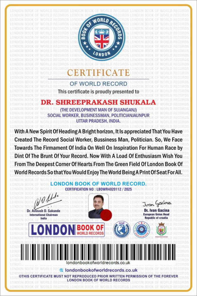 उत्तर प्रदेश,जौनपुर जिले के सुजानगंज ब्लॉक प्रमुख प्रतिनिधि श्री प्रकाश शुक्ल के सामाजिक- विकास कार्यो को ध्यान में रखते हुए उन्हें लंदन बुक ऑफ वर्ल्ड रिकार्ड से सम्मानित किया गया है।