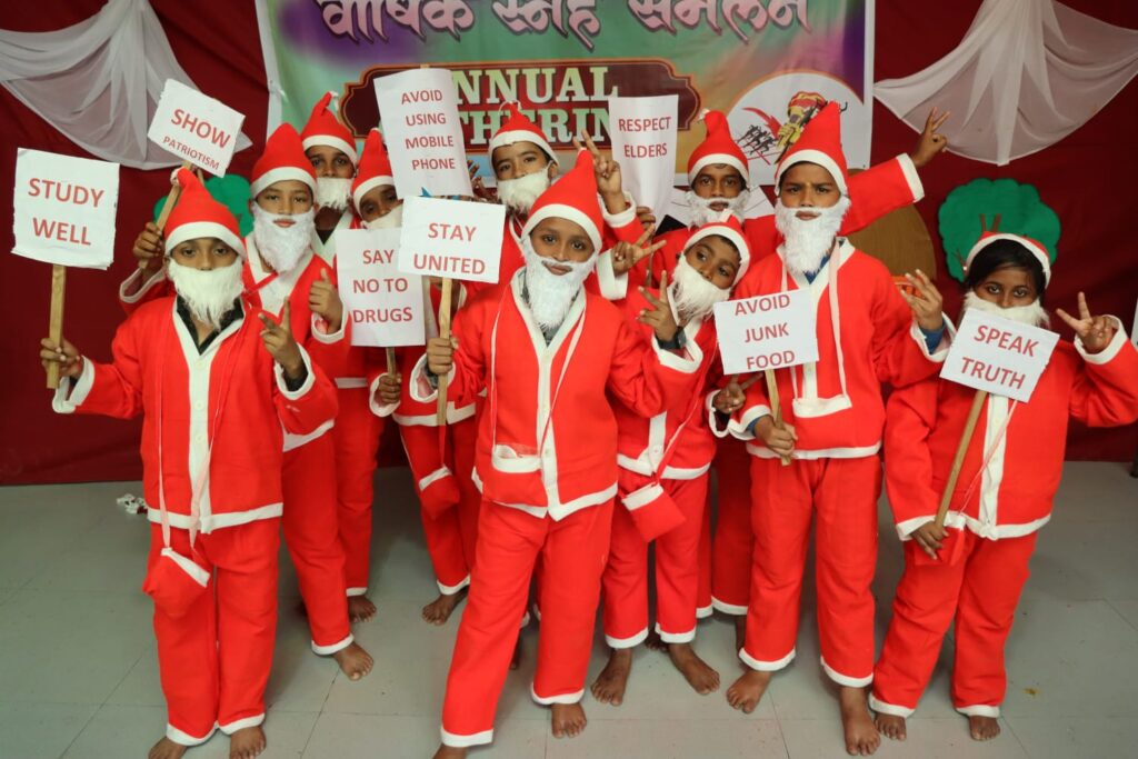 विद्यार्थियों ने हाथों में बोर्ड लेकर जिंगल बेल, जिंगल बेल, जिंगल ऑल द…. गीत गाते हुए उपस्थित विद्यार्थियों व अभिभावकों को संदेश दिया। बता दें कि इस वर्ष का वार्षिक स्नेह सम्मेलन स्कूल के सचिव राजेश सुभेदार, कार्याध्यक्ष ज्योति सुभेदार की संकल्पना से आयोजित किया गया। इस दौरान कैलेंडर वर्ष के अंत में, युवा शराब और अन्य व्यसनों से नए साल का स्वागत करते हैं, लेकिन यह संदेश देना हमारी भारतीय परंपरा नहीं है कि युवाओं को शराब और अन्य हानिकारक पदार्थों से दूर रहना चाहिए स्कूल के सचिव राजेश सुभेदार ने बताया कि इस वर्ष स्नेह सम्मेलन में बच्चों ने सांता क्लॉज बनकर संदेश भेजा।